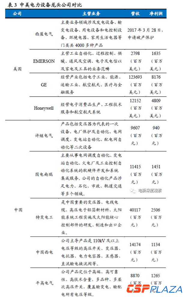 由于1975-1999年的20多年美國輸變電主網(wǎng)投資額處于停滯狀態(tài),因此美國電力設備龍頭均呈現(xiàn)多元化的業(yè)務結(jié)構(gòu)。通過中美電力設備龍頭公司的對比,美國電力設備公司與中國電力設備公司均在其傳統(tǒng)業(yè)務領域存在明顯瓶頸,美國電力設備龍頭多向其他領域轉(zhuǎn)型延伸,因此業(yè)績規(guī)模較大,中國電力設備龍頭的業(yè)務尚未多元化,業(yè)績規(guī)模相對較小。