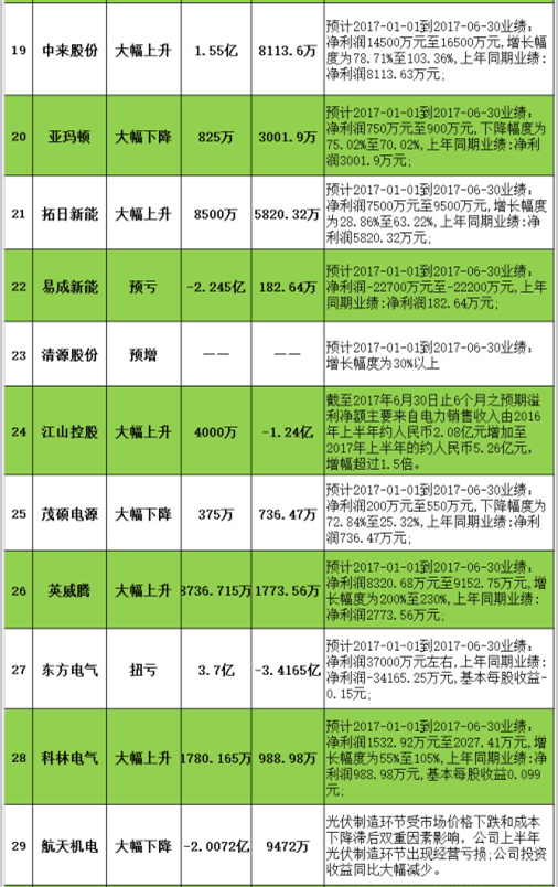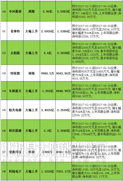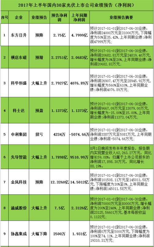 與此同時,光伏企業(yè)業(yè)績同樣表現(xiàn)搶眼。從已公布的30家國內(nèi)光伏上市企業(yè)的上半年業(yè)績預(yù)告看,絕大部分光伏企業(yè)處于盈利狀態(tài),只有少數(shù)幾家企業(yè)業(yè)績虧損或預(yù)降。而從凈利潤來看,不難發(fā)現(xiàn),增速最快的是科華恒盛,其漲幅高達(dá)560%左右,信義光能的EPC業(yè)務(wù)則是最讓人“眼紅”的。更多企業(yè)信息,請看下表: