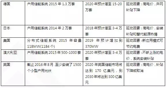 根據(jù)IHSHtechnology發(fā)布的報告預(yù)測至2018年,戶用光伏儲能容量將達(dá)到900MW。美國、日本、德國、澳大利亞和英國作為傳統(tǒng)的光伏儲能強(qiáng)國在技術(shù)開發(fā)儲備,政策導(dǎo)向、市場開拓等方面領(lǐng)先于其他國家和地區(qū),表1 概述和預(yù)計上述5個國家戶用光伏儲能信息。