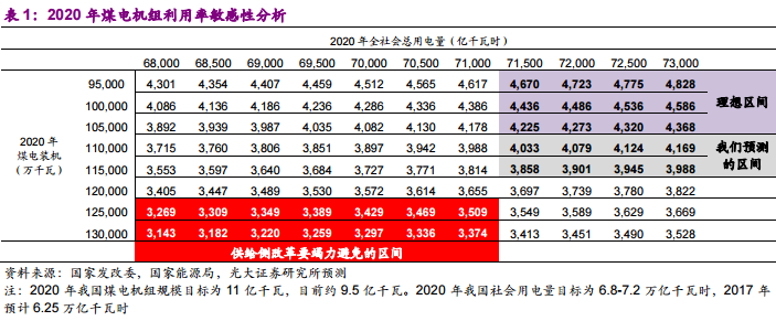 表1:2020年煤電機(jī)組利用率敏感性分析