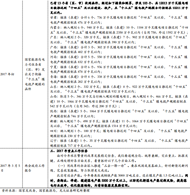 2016年11月,國家發(fā)改委、能源局對(duì)外正式發(fā)布《電力發(fā)展“十三五”規(guī)劃》,規(guī)劃提出,加快煤電轉(zhuǎn)型升級(jí),促進(jìn)清潔有序發(fā)展,“十三五”期間,取消和推遲煤電建設(shè)項(xiàng)目1.5億千瓦以上,到2020年全國煤電裝機(jī)規(guī)模力爭控制在11億千瓦以內(nèi),占比降至約55%。力爭淘汰火電落后產(chǎn)能2000萬千瓦以上。