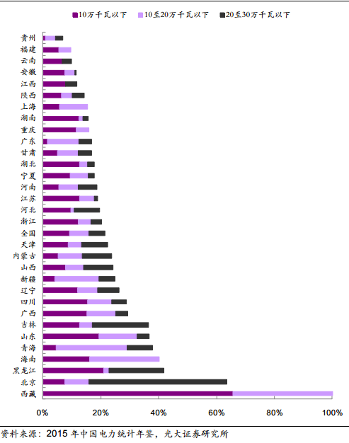 如下圖統(tǒng)計(jì)可以看出,30萬千瓦以下級(jí)火電機(jī)組占比超過全國平均水平21.43%的地區(qū)有14個(gè),多集中在華北、東北和西北區(qū)域以及個(gè)別水電大省,這些地區(qū)供給側(cè)改革的空間較大,若能順利快速實(shí)施,所在區(qū)域機(jī)組質(zhì)量優(yōu)質(zhì)的火電企業(yè)將會(huì)獲得利用小時(shí)的提升空間。建議關(guān)注的地方上市公司包括:京能電力、金山股份、天富能源、漳澤電力、通寶能源、內(nèi)蒙華電等。