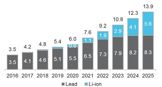 彭博新能源財(cái)經(jīng)公司分析師預(yù)計(jì),北美和歐洲兩個(gè)地區(qū)數(shù)據(jù)中心的備份電池總體需求將從2016年的3.5吉瓦時(shí)上升到2025年的14吉瓦時(shí)。在此期間,鋰離子電池市場份額將從1%上升至35%。