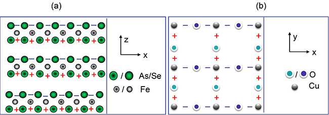 (a)在鐵基超導(dǎo)體新超導(dǎo)態(tài)中的位相分布, 在上下As(Se) 層位相符號相反;(b) 在銅基高溫超導(dǎo)體的d-波配對超導(dǎo)態(tài)中的位相分布??梢钥闯鲈谘醯膬商鬃泳Ц裎幌喾栆蚕喾?。