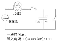 只有當(dāng)介質(zhì)吸收電流為0時,此時的流入電流才是漏電電流,這大概需要連續(xù)充電100個小時才能達到,此時漏電流大概為幾微安。在這個點以后,為了繼續(xù)測量流入電流,需要使用一只準確的微伏表與一只比較大的電阻,數(shù)值參看上圖。