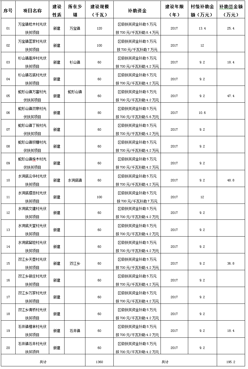 中國儲能網(wǎng)訊:根據(jù)《關(guān)于開展光伏產(chǎn)業(yè)扶貧工作的指導(dǎo)意見》(婁星政辦發(fā)〔2017〕7號)和《關(guān)于全區(qū)易地扶貧搬遷和省級扶貧村光伏項(xiàng)目工作會議紀(jì)要》(婁星府閱〔2017〕10號)精神,對光伏扶貧項(xiàng)目按區(qū)級700元/千瓦的補(bǔ)償資金列入當(dāng)年財(cái)政預(yù)算解決,另從區(qū)扶貧辦產(chǎn)業(yè)扶持中安排每個(gè)省級貧困村5萬元。根據(jù)項(xiàng)目建設(shè)進(jìn)度,經(jīng)鄉(xiāng)鎮(zhèn)申請,2017年我區(qū)建設(shè)20個(gè)省級貧困村1360千瓦撥付財(cái)政扶貧資金195.2萬元予以公示,具體明細(xì)見附表。