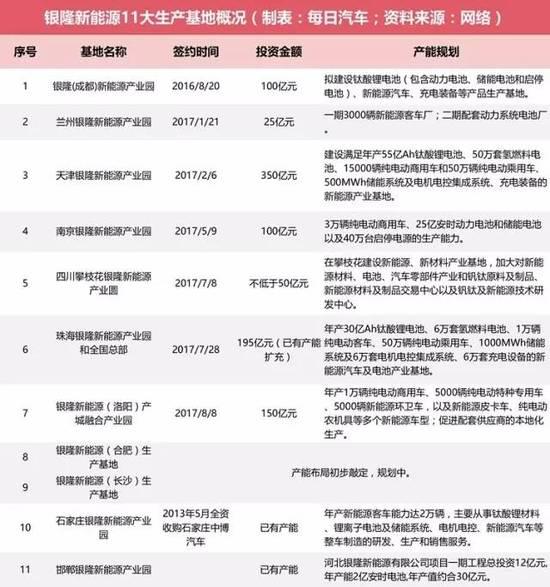 1月21日,蘭州銀隆新能源產(chǎn)業(yè)園項(xiàng)目簽約,前兩期共計(jì)劃投資25億元建設(shè)新能源客車生產(chǎn)基地,已于5月開工。5月4日,珠海銀隆全資子公司廣通汽車向江蘇九龍汽車制造有限公司采購26.55億元的電動(dòng)物流車。同月,總投資100億元的銀隆新能源南京基地在溧水區(qū)開工,建設(shè)周期為2017年至2018年。