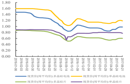 2016 年同期受電價(jià)后續(xù)下調(diào)預(yù)期不明等影響,需求量下降帶來組價(jià)價(jià)格大幅下滑,大部分光伏企業(yè)出現(xiàn)大規(guī)模減產(chǎn)、停產(chǎn)等情況。今年“630”出現(xiàn)較大不同,新技術(shù)帶來成本下降幅度超預(yù)期,國(guó)內(nèi)需求穩(wěn)定,疊加美國(guó)“201 條款”帶來海外需求的上漲。今年 4 月以來,光伏產(chǎn)品售價(jià)出現(xiàn)一定程度上漲,多晶硅、單晶硅電池現(xiàn)貨價(jià)(周均價(jià))由 0.85 美元/片、1.1 美元/片分別上漲至 0.98 美元/片、1.2 美元/片,上漲幅度達(dá)到 15.3%和 9.1%。