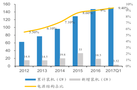 2016年全球累計(jì)吊裝容量達(dá)到486.8GW,其中新增裝機(jī)風(fēng)電容量為54.6GW,國(guó)內(nèi)市場(chǎng)占比 43%。全球風(fēng)能理事會(huì)預(yù)計(jì) 2017 年全球風(fēng)電新增裝機(jī)容量將超過60GW,并在未來五年內(nèi)維持穩(wěn)定增長(zhǎng),到 2021 年累計(jì)裝機(jī)將超過 800GW。截止 2017 年 1 季度末,國(guó)內(nèi)累計(jì)風(fēng)電并網(wǎng)容量 151GW,環(huán)比增加 3.52GW。風(fēng)電裝機(jī)占電源總裝機(jī)的比重持續(xù)提高至 9.4%。