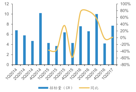 今年以來,國(guó)內(nèi)公開招標(biāo)容量為 7.7GW,維持去年同期較高水平。2016 年全年公開招標(biāo)容量達(dá)到 28.3GW,同比增長(zhǎng) 51.3%。從風(fēng)電消納來看,今年風(fēng)電消納持續(xù)好轉(zhuǎn),一季度上網(wǎng)電量 687 億 kWh,占全社會(huì)用電量的 4.8%,較同期增長(zhǎng)0.6%。預(yù)計(jì)風(fēng)電消納占比到 2020 年有望達(dá)到 6%以上。