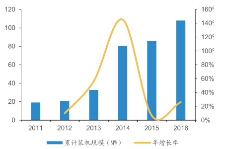 2011-2016年國(guó)內(nèi)投運(yùn)儲(chǔ)能裝機(jī)量(不含抽水儲(chǔ)能和儲(chǔ)熱項(xiàng)目)