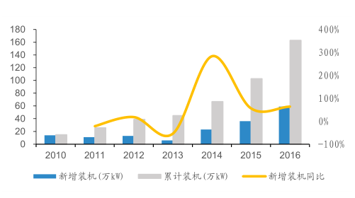 2016年中國(guó)海上風(fēng)電新增和累計(jì)裝機(jī)容量
