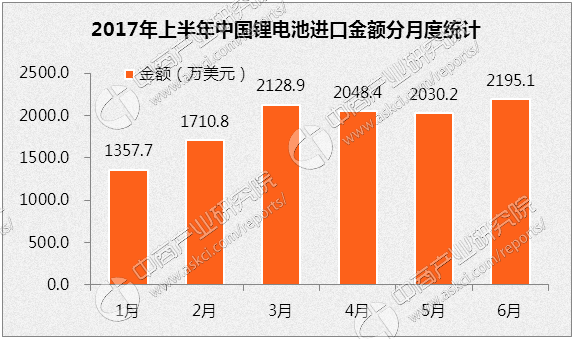 2017年上半年中國鋰電池出口總額為1.43億美元,同比下降25.54%,出口數(shù)量為5.96億個(gè),同比下降44.39%。