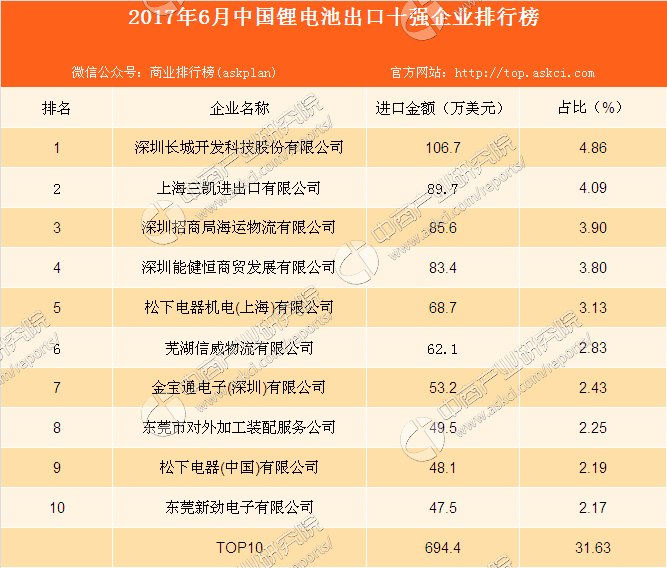 2017年6月中國鋰電池進(jìn)口企業(yè)約為550家。其中,排在前十企業(yè)合計(jì)進(jìn)口694.4萬美元,占出口總額的31.63%。2017年6月鋰電池進(jìn)口前十企業(yè)如下:
