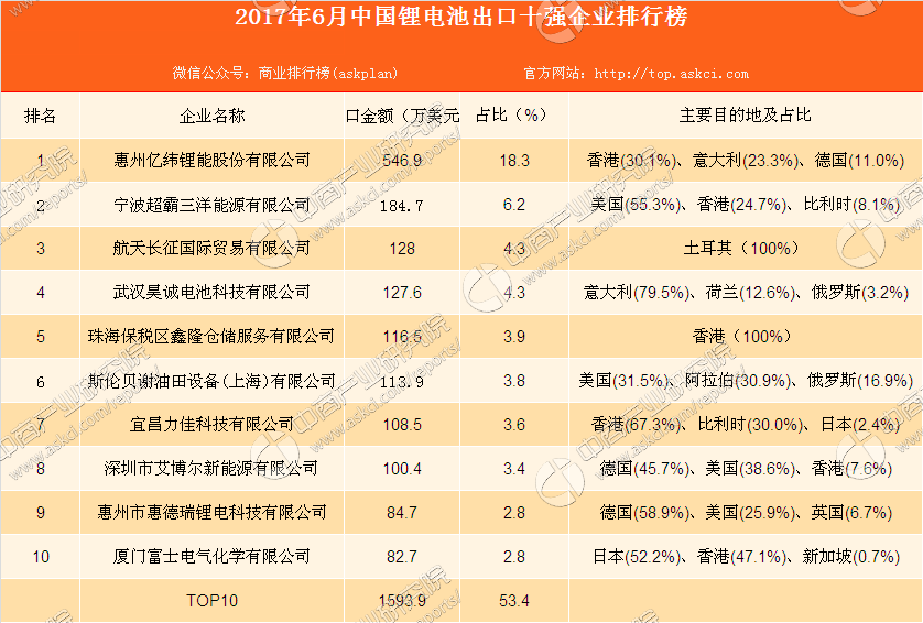 2017年1-6月中國鋰電池進(jìn)出口十強(qiáng)排行榜