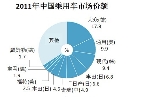 美德企業(yè)在中國新車市場上保持優(yōu)勢(shì)。作為上世紀(jì)80年代初就進(jìn)入中國的外資企業(yè),德國大眾汽車在中國乘用車市場上占據(jù)著近20%的最大份額;上世紀(jì)90年代開始,在中國國內(nèi)從事生產(chǎn)的美國通用汽車也在中國市場上推出了從小型車到高檔車的多種車型;高檔車市場上,大眾汽車旗下的奧迪、德國戴姆勒、寶馬等品牌影響力已經(jīng)在中國深入人心。