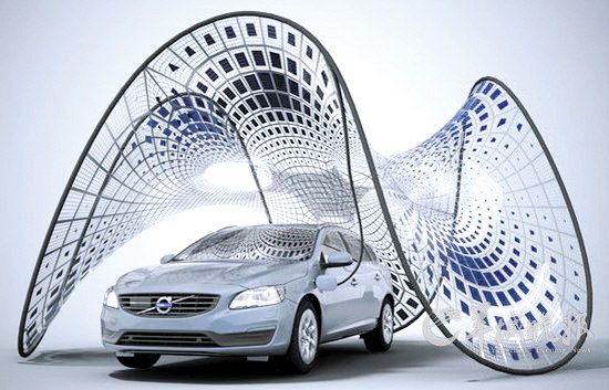 這個太陽能電池板采用了可折疊設(shè)計。當你把車停下來時,這個太陽能電池板就可以打開,通過太陽能為汽車的電源充電。只是打開之后你可能嚇一跳,因為這看起來就像一個巨大的花朵。而且是比汽車還巨大。難道說這種設(shè)計,可以馬上把汽車的電充滿?因為畢竟如此的設(shè)計,必須有足夠大的停車場才行。不過似乎并不是。據(jù)了解,這個解決方案被稱作“Pure Tension”(純張力),它是一款便攜式的大帳篷,展開后就是拋物線的形狀,上面嵌入了一系列的太陽能光伏面板。不過給電池充滿電需要一整天的時間。據(jù)稱,目前這套太陽能充電系統(tǒng)已經(jīng)能在沃爾沃V60混合動力版上良好運行。
