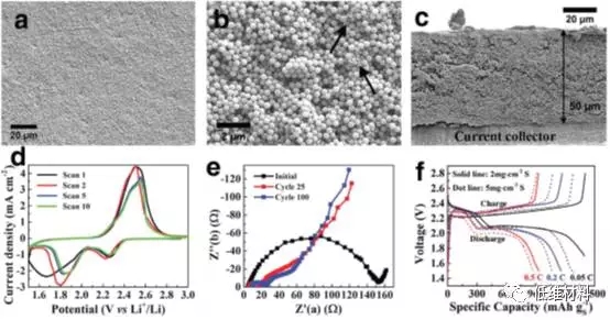 圖3,NCNS-S70作為鋰硫電池電極電極時的結(jié)構(gòu)及電化學(xué)性能表征。(3a與3b)負(fù)載量為5 mg cm-2 電極材料的表面形貌圖,結(jié)果顯示電極材料緊密堆疊且結(jié)構(gòu)完整。(3c)電極材料的截面圖,顯示電極內(nèi)部也為緊密堆疊且平滑均勻的結(jié)構(gòu)。(3d-3f)電池的電化學(xué)性能測試,包括CV曲線,EIS曲線以及電池在0.05C, 0.2C, 0.5C倍率下的充放電曲線。