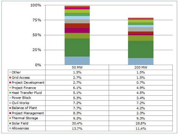 上表顯示,一個裝機(jī)200MW的光熱電站,相對于一個裝機(jī)50MW的光熱電站,其均化成本可降低將近25%,成本下降效益顯著。
