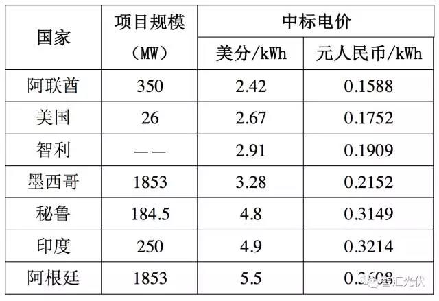 表:近期國際光伏項(xiàng)目的上網(wǎng)電價(jià)中標(biāo)價(jià)格
