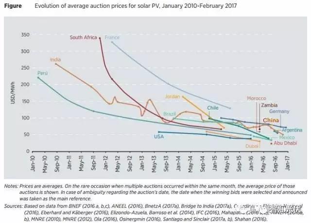 根據(jù)國際可再生能源署最新發(fā)布的《可再生能源競價(jià)分析報(bào)告》,到2016年中已經(jīng)至少有67個(gè)國家以競價(jià)方式確定可再生能源項(xiàng)目。相比固定的標(biāo)桿價(jià)格,可再生能源競價(jià)有效地降低了可再生能源上網(wǎng)的價(jià)格。相對(duì)于2010年,6年內(nèi),光伏電價(jià)下降幅度更達(dá)到80%,為50美元/MWh(相當(dāng)于人民幣0.33元/kWh)。