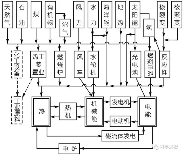 20世紀(jì)80年代初, 在對能源利用的核心科學(xué)問題進(jìn)行全面深入地綜合與總結(jié)后, 吳仲華提出了基于熱能品位概念的“溫度對口、梯級利用”理念, 作為普遍適用的熱能利用原理, 對能源動力的發(fā)展應(yīng)用具有重要的意義。他通過圖1來表示各種能源經(jīng)過各種設(shè)備轉(zhuǎn)化為各種不同形式的能來使用的情況。他認(rèn)為在開發(fā)利用能源時, 要認(rèn)真比較各種能源的優(yōu)缺點, 對各種能源的品質(zhì)很好地加以綜合考慮; 現(xiàn)代科學(xué)技術(shù)的發(fā)展將為較大幅度地提高能源利用率提供可能性和多樣性, 但都必須重視基于能的品位概念的梯級利用理念。