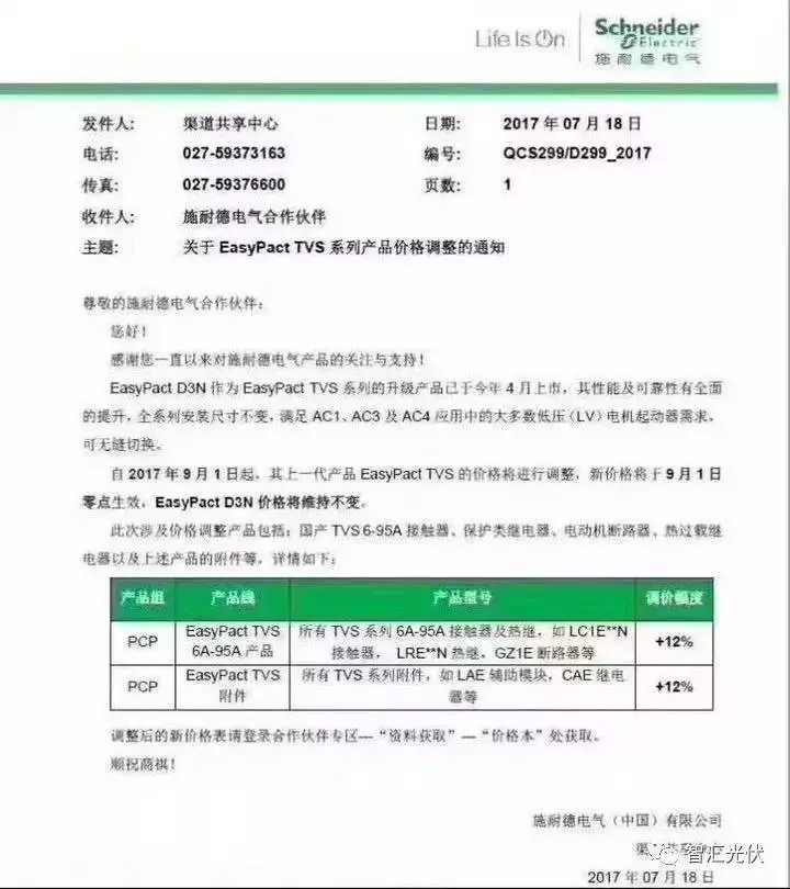 施耐德電氣的調(diào)價(jià)公函