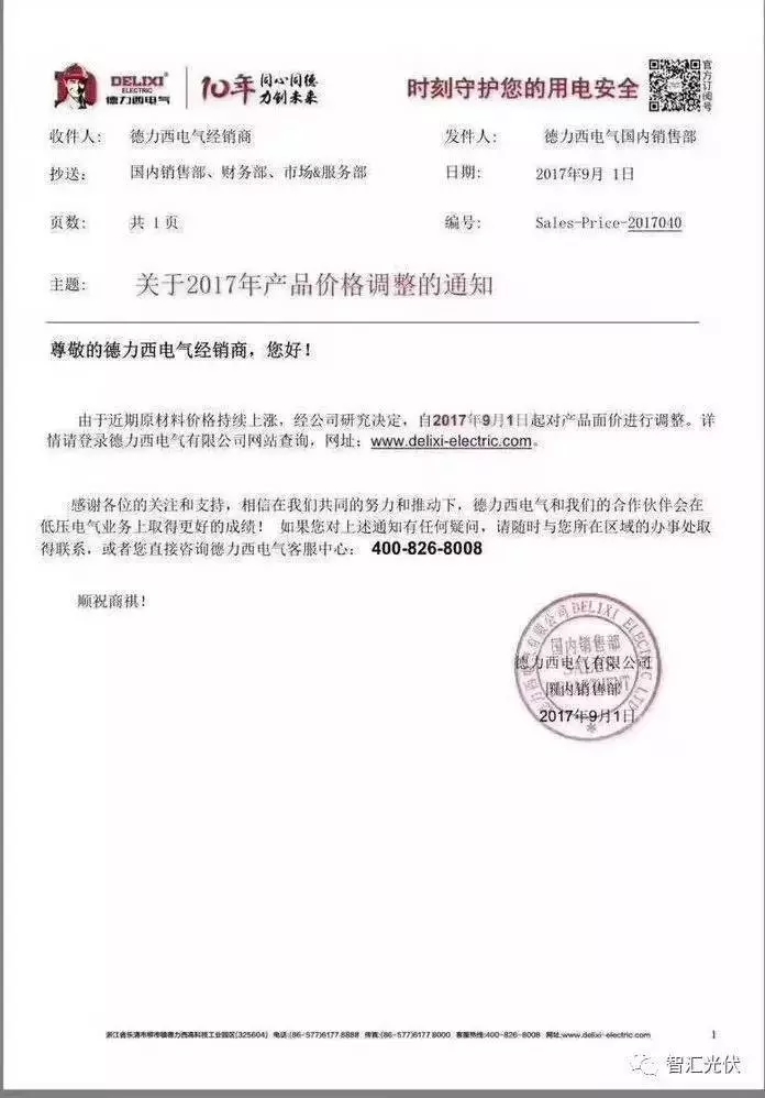德力西電氣的調(diào)價(jià)公函