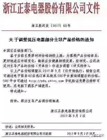 正泰低壓電器的調(diào)價(jià)公函