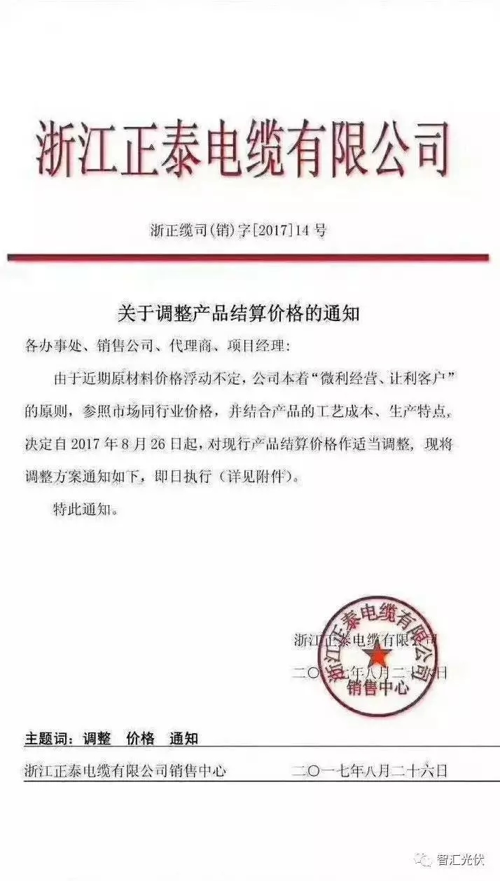 正泰電纜的調(diào)價(jià)公函