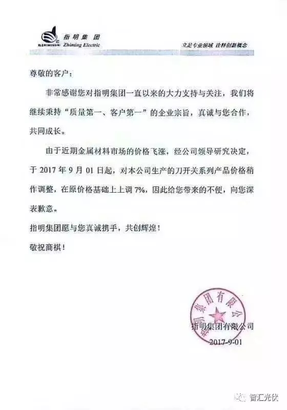 指明集團(tuán)的調(diào)價(jià)公函