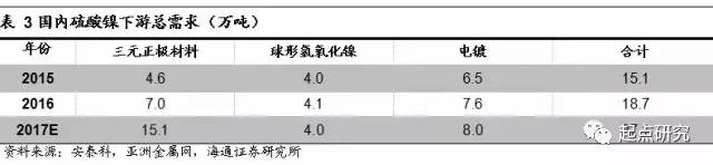 由電動(dòng)汽車網(wǎng)數(shù)據(jù)顯示,2016年全國正極材料產(chǎn)量16.16萬噸,同比2015年增長43%;其中三元材料產(chǎn)量5.43萬噸,同比增長49%。據(jù)高工鋰電數(shù)據(jù)我國目前正極材料仍以NCM為主,2016年NCM333占比20%,NCM523占比75%,NCM622、NCA占比5%,其中NCA占比不足1%,按照每噸不同三元材料所需硫酸鎳計(jì)算,對應(yīng)的電池級(jí)硫酸鎳總需求為6.99萬噸;球鎳產(chǎn)量為1.5萬噸與15年幾乎持平,球鎳含鎳量為60%,據(jù)此可推算出消耗電池級(jí)硫酸鎳4.1萬噸;傳統(tǒng)電鍍行業(yè)硫酸鎳需求穩(wěn)定,根據(jù)安泰科資訊2016年需求7.6萬噸,16年國內(nèi)硫酸鎳總需求合計(jì)18.7萬噸。預(yù)計(jì)17年傳統(tǒng)電池仍維持原狀,長江有色金屬網(wǎng)預(yù)計(jì)電鍍工業(yè)每年會(huì)有5%的同比增速;電池級(jí)硫酸鎳受新能源汽車帶動(dòng),安泰科預(yù)計(jì)2017年全年動(dòng)力電池出貨量36GWh,而三元材料有望占比50%左右即18GWh,是16年的近三倍。預(yù)計(jì)17年全年三元材料產(chǎn)量10.0萬噸,再結(jié)合三元占比趨勢(高鎳化發(fā)展)可估算17年硫酸鎳需求總量,年均復(fù)合增長率達(dá)35.2%。