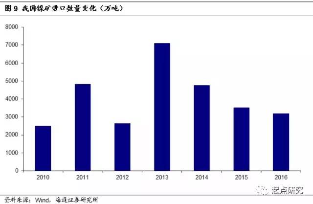 對于國內(nèi)的硫酸鎳企業(yè)來說,事情又不一樣。由于鎳中間品主要由紅土鎳礦通過氫氧化物沉淀的技術(shù)制備,而紅土鎳礦大都依賴進(jìn)口,近年來鎳價(jià)低迷逼停了很多國外的中小型鎳礦山,我國鎳礦進(jìn)口數(shù)量自2013年以來連年下滑,因此國內(nèi)的硫酸鎳企業(yè)反映的是原料不足。國內(nèi)目前只有金川集團(tuán)擁有自產(chǎn)硫化礦,格林美擁有鎳回收生產(chǎn)線,對進(jìn)口的需求不大。
