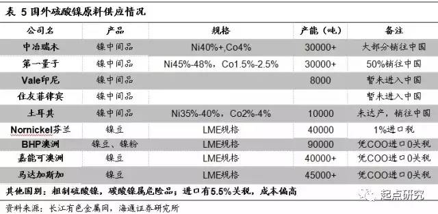 據(jù)安泰科估計(jì),2017年國內(nèi)硫酸鎳產(chǎn)量將上升至30萬噸;國外方面產(chǎn)量約為20萬噸,除了住友集團(tuán)、優(yōu)美科和俄鎳,還有幾家企業(yè)在產(chǎn)。我們根據(jù)此后的擴(kuò)產(chǎn)情況推測,2018年全球硫酸鎳將進(jìn)一步上升至60萬噸左右。