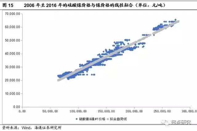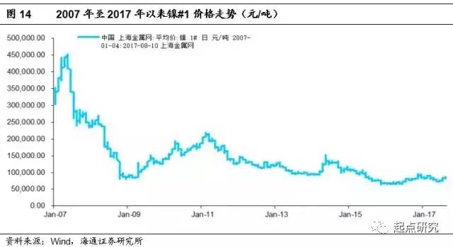 從硫酸鎳價(jià)格和鎳價(jià)格的線性擬合圖,我們發(fā)現(xiàn)兩者呈現(xiàn)高度相關(guān)性;通過回歸性測試發(fā)現(xiàn),兩個(gè)的價(jià)格相關(guān)性達(dá)到0.98。因此我們可以通過對未來硫酸鎳價(jià)格的推斷來反向驗(yàn)證我們對鎳價(jià)格的預(yù)期。受益于三元材料拉動(dòng)硫酸鎳價(jià)格緩慢升至目前的25500萬元/噸,同時(shí)可以觀察到硫酸鎳同電解鎳的價(jià)差進(jìn)一步拉大(一頓硫酸鎳需要0.22噸電解鎳),由年初的3000~4000元/噸提升至目前的7000~8000元/噸,綜合來看目前鎳價(jià)處于歷史低位。