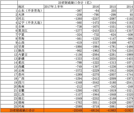 數(shù)據(jù)顯示,我國(guó)25省自2014年到2016年財(cái)政補(bǔ)貼缺口逐年增大,到今年上半年財(cái)政缺口合計(jì)高達(dá)25349億元,而僅有的7省市財(cái)政盈余合計(jì)為17281億元,要填補(bǔ)25省的財(cái)政缺口讓財(cái)政部捉襟見(jiàn)肘。