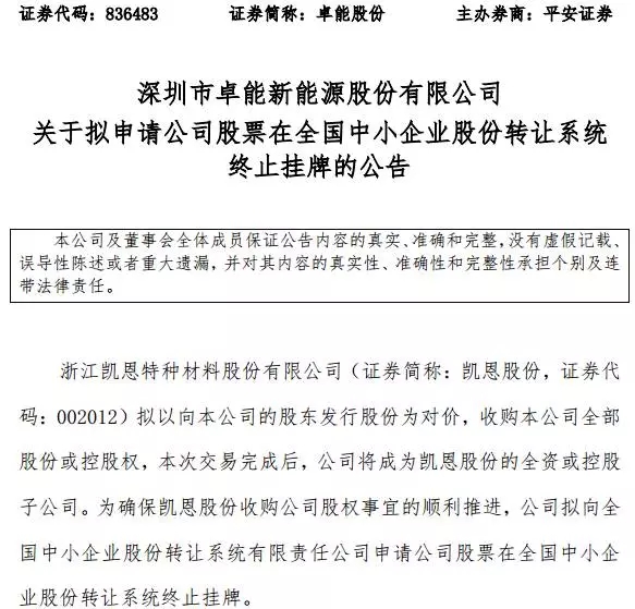 中國(guó)儲(chǔ)能網(wǎng)訊:卓能股份(836483)9月1日公告稱,浙江凱恩特種材料股份有限公司(證券簡(jiǎn)稱:凱恩股份,證券代碼:002012)擬以向公司的股東發(fā)行股份為對(duì)價(jià),收購公司全部股份或控股權(quán),本次交易完成后,公司將成為凱恩股份的全資或控股子公司。為確保凱恩股份收購公司股權(quán)事宜的順利推進(jìn),公司擬向全國(guó)中小企業(yè)股份轉(zhuǎn)讓系統(tǒng)有限責(zé)任公司申請(qǐng)公司股票在全國(guó)中小企業(yè)股份轉(zhuǎn)讓系統(tǒng)終止掛牌。