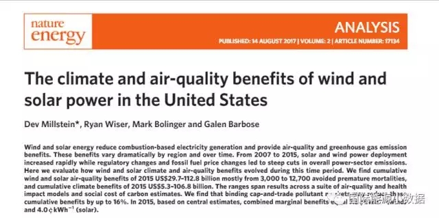中國儲(chǔ)能網(wǎng)訊:在光伏、風(fēng)電的發(fā)展過程中,大多數(shù)人都在關(guān)注其成本的下降,特別是何時(shí)實(shí)現(xiàn)平價(jià)上網(wǎng),但是對(duì)于光伏、風(fēng)電的公共效益往往只是定性描述。針對(duì)這個(gè)問題,美國勞倫斯伯克利國家實(shí)驗(yàn)室研究人員在最新一期《自然·能源》發(fā)表文章,對(duì)因?yàn)轱L(fēng)電、光伏帶來的空氣改善所帶來的公共收益進(jìn)行了量化計(jì)算,具體計(jì)算過程和結(jié)果可參見以下三個(gè)表格(美國各地區(qū)光伏風(fēng)電比例、污染物減排數(shù)字、因減排帶來的經(jīng)濟(jì)收益)。