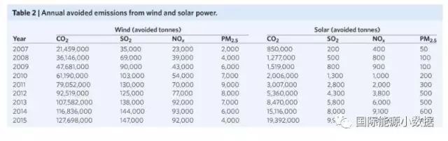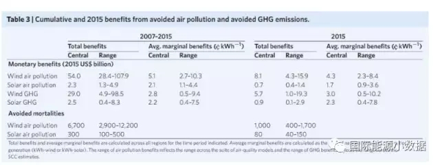 綜上表所述,2007年至2015年間,美國因光伏、風(fēng)電的發(fā)電量減少二氧化硫排放100萬噸、氮氧化物60萬噸、PM2.55萬噸。伯克利實(shí)驗(yàn)室估計(jì),相應(yīng)地空氣改善使得7000人避免了過早死亡,相當(dāng)于節(jié)省了560億美元的公共健康開支。此外,這期間因光伏、風(fēng)電避免的二氧化碳排放相當(dāng)于320億美元。2015年,美國風(fēng)電的空氣質(zhì)量和氣候平均收益相當(dāng)于7.3美分/千瓦時(shí),而光伏的收益為4.0美分/千瓦時(shí)。上述數(shù)字為全美的平均值,各地具體收益有所不同,特別是中大西洋地區(qū)的風(fēng)電收益高達(dá)14.3美分/千瓦時(shí),而加利福尼亞風(fēng)電收益僅有2.5美分/千瓦時(shí)。