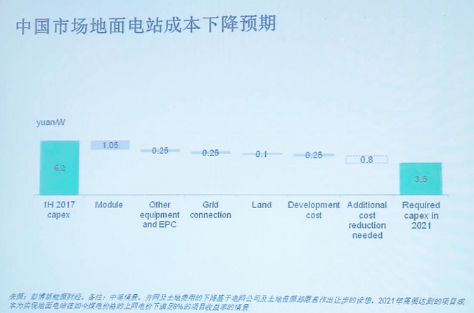中短期市場(chǎng)看,金剛線多晶片的需求持續(xù)擴(kuò)大推動(dòng)降本,供貨能力提升,多晶組件價(jià)格有望在2.7-2.8價(jià)位基礎(chǔ)上平穩(wěn)下降。近期因?yàn)閱尉Ч杵堫^廠檢修、瓦克美國(guó)工廠爆炸事故影響硅料進(jìn)口,市場(chǎng)單晶硅片均價(jià)上調(diào)到6 - 6.2元/片,短期內(nèi)單晶組件在3元/瓦以上仍上揚(yáng)。展望四季度甚至2018年初,整個(gè)國(guó)內(nèi)、外市場(chǎng)需求都會(huì)下降。從11月開(kāi)始,美國(guó)201調(diào)查、印度對(duì)華光伏“雙反”、日本FIT的調(diào)整,總體需求可能大幅下跌;國(guó)內(nèi)方面,11月底今年能并網(wǎng)的項(xiàng)目基本都完成了組件發(fā)貨,明年初價(jià)格可能會(huì)跳水。未來(lái)數(shù)年,根據(jù)彭博新能源財(cái)經(jīng)數(shù)據(jù),2021年中國(guó)地面電站總體成本將從當(dāng)前6.2元/瓦下降到3.5元/瓦,組件成本會(huì)下降到2元以下。