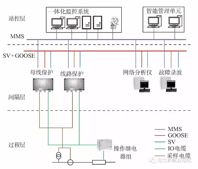 保護就地化變電站與當前智能站都遵循IEC61850協(xié)議,均保持“三層兩網(wǎng)”的結(jié)構(gòu),但實現(xiàn)方式上發(fā)生了變革。首先,由于采用電纜直采直跳,取消了合并單元和智能終端,只需要操作繼電器組作為保護裝置與開關(guān)機構(gòu)的接口;而且間隔內(nèi)無網(wǎng)絡(luò),因而可取消過程層交換機,只需在中心交換機增設(shè)端口即可,簡化了過程層設(shè)備。保護裝置具備SV和GOOSE輸出功能,供站域保護、故障錄波和網(wǎng)絡(luò)分析等設(shè)備使用。此外,就地化安裝模式要求設(shè)備取消液晶面板,因此需要增設(shè)智能管理單元,連接于站控層網(wǎng)絡(luò)。智能管理單元對站內(nèi)就地化保護設(shè)備進行界面集中展示、備份管理、保護設(shè)備在線監(jiān)視與診斷等功能。智能管理單元與不同廠家的保護裝置之間可實現(xiàn)互聯(lián)互通,對各廠家保護裝置采用統(tǒng)一的顯示和操作界面。