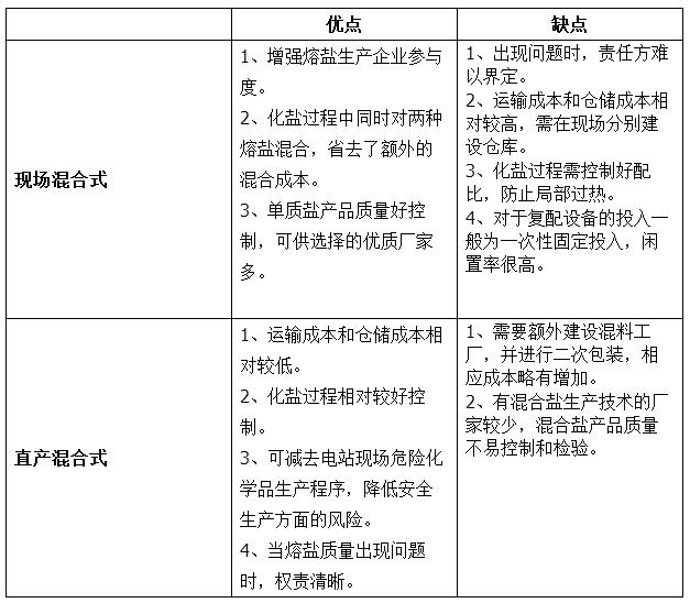 通常情況下,熔鹽供應(yīng)可采用現(xiàn)場(chǎng)混合熔化或者直接供應(yīng)混合熔鹽的方式。硝酸鉀和硝酸鈉早期主要應(yīng)用于工業(yè)及農(nóng)業(yè),對(duì)產(chǎn)品品質(zhì)要求相對(duì)光熱發(fā)電領(lǐng)域較低。市場(chǎng)上的供應(yīng)商以單體為主,基本沒(méi)有復(fù)合熔鹽的供應(yīng)商。所以,早期國(guó)外的光熱電站建設(shè)時(shí),大多直接選購(gòu)硝酸鉀和硝酸鈉,再進(jìn)行現(xiàn)場(chǎng)復(fù)配。但進(jìn)入光熱電站系統(tǒng)的最終熔鹽產(chǎn)品不是硝酸鉀單體、也不是硝酸鈉單體,而是二者按照一定比例復(fù)配后形成的混合共晶鹽。CSPPLAZA記者根據(jù)受訪各方反饋總結(jié)了兩種方式的優(yōu)缺點(diǎn)。
