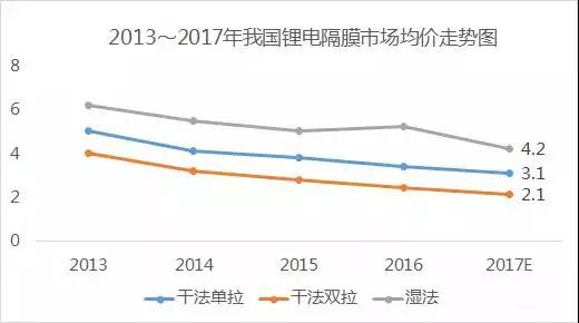 在上圖中顯示的數(shù)據(jù)中,預(yù)測2017年濕法隔膜價格會達(dá)到4.1元/㎡,實(shí)際上,在2017年上年,濕法隔膜的均價已跌破4元/㎡。
