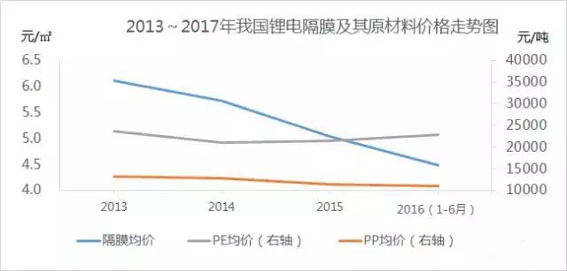 自2013年開始,我國鋰電隔膜材料價格呈現(xiàn)下滑趨勢,截止2016年干法和濕法隔膜材料價格下降均超過35%,然同期聚丙烯價格降幅不超過20%,聚乙烯價格降幅不超過5%。