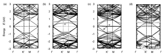 圖3 不同類型石墨烯能帶結(jié)構(gòu):(a)完整石墨烯;(b)585-V2缺陷;(c)S-W缺陷;(d)N 石墨烯