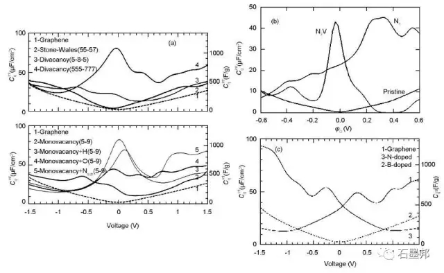 完整的石墨烯量子電容非常小,在充電或放電過(guò)程中難以為電子提供足夠的能態(tài)來(lái)存儲(chǔ)電荷。為了提高石墨烯的量子電容,首先考慮到的是在石墨烯中引入缺陷結(jié)構(gòu),改善石墨烯在費(fèi)米能級(jí)處的DOS。對(duì)于SW缺陷,由于費(fèi)米能級(jí)處存在五元環(huán)和八元環(huán)碳原子上pz態(tài)組成的能帶,該能帶將會(huì)容納額外的電子,進(jìn)而提高石墨烯可聚集的電量。同時(shí),由于存在pz準(zhǔn)局域態(tài),V2缺陷中缺陷附近的C原子也會(huì)容納額外的電子。SW缺陷在作為負(fù)極時(shí)存儲(chǔ)電荷非常有效,而V2缺陷則在作為正極時(shí)表現(xiàn)出良好的電荷存儲(chǔ)行為。晶格中C原子被N和B替換后都會(huì)對(duì)量子電容產(chǎn)生影響,前者對(duì)正偏壓范圍內(nèi)量子電容提高,后者則是對(duì)負(fù)偏壓范圍內(nèi)量子電容提高。