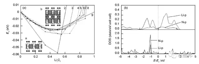 圖5 不同結(jié)構(gòu)石墨烯與Li相互作用:(a)少層石墨烯; (b) Li與摻N石墨烯的態(tài)密度