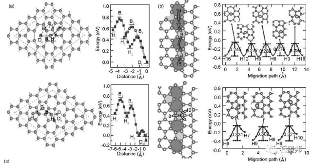 在鋰離子電池系統(tǒng)中,石墨烯除能夠存儲(chǔ)Li之外,還有一個(gè)重要的考察因素是石墨烯對(duì)Li離子擴(kuò)散過(guò)程的影響,這直接影響鋰離子電池的快速充放電行為。擴(kuò)散過(guò)程包括兩方面,Li在石墨烯表面上并以與表面平行的方向進(jìn)行擴(kuò)散,另外一種是穿過(guò)石墨烯平面,以與平面垂直的方向擴(kuò)散。
