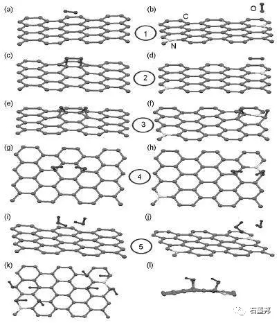 N 原子經(jīng)常引入到石墨烯內(nèi)部來(lái)調(diào)控其電子結(jié)構(gòu)。N摻雜石墨烯可以通過(guò)含N 前驅(qū)體對(duì)石墨烯或者氧化石墨烯后處理得到缺陷點(diǎn)的存在會(huì)減少N摻雜的形成能,所以N在缺陷石墨烯的摻雜比完整石墨烯容易,在N 摻雜之前有意引入缺陷會(huì)提高摻雜效果。對(duì)于完整石墨烯,由于N原子之間存在排斥力,N 原子摻雜位置分布比較分散,但是當(dāng)存在缺陷時(shí),由于缺陷與N之間的吸引力,缺陷附近區(qū)域N的分布將會(huì)非常集中。