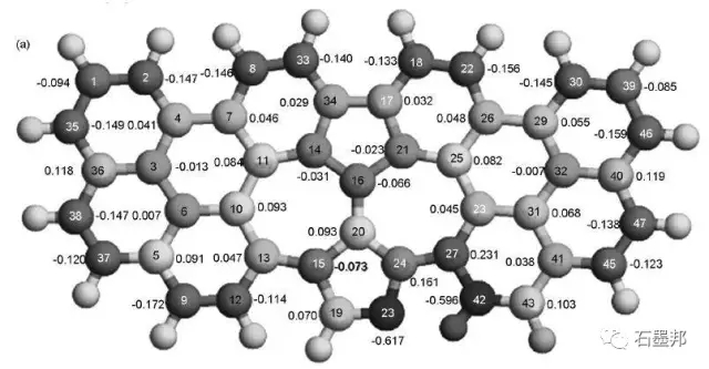 科學(xué)家使用團(tuán)簇結(jié)構(gòu)的石墨烯模型研究了含N石墨烯在酸性環(huán)境中對(duì)O2的催化機(jī)理。計(jì)算表明,OOH吸附在靠近吡啶結(jié)構(gòu)N的C原子上,其中一個(gè)O與C原子相互作用,并且該C原子從石墨烯平面伸出。對(duì)于吡咯N,OOH同樣會(huì)吸附在靠近N 的C原子上。當(dāng)在OOH上進(jìn)一步增加H后,吡啶N和吡咯N石墨烯上都會(huì)形成不穩(wěn)定的HOOH,O—O鍵長(zhǎng)增加,容易變成兩個(gè)OH,所以在N石墨烯上的ORR是四電子過(guò)程。同時(shí),作者提出自旋密度和電荷密度是決定催化效果的關(guān)鍵因素。盡管有的C電荷密度非常高,但是OOH更容易吸附在具有高自旋密度的C原子上。與電荷密度相比,自旋密度更能決定催化活性位,只有當(dāng)自旋密度非常小時(shí)電荷密度才起作用。圖9給出了所計(jì)算的摻N石墨烯上電荷密度和自旋密度分布。